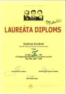 Paldies skolotājai Zandai Gertnerei-Klicenko par audzēknes sagatavošanu olimpiādei!
